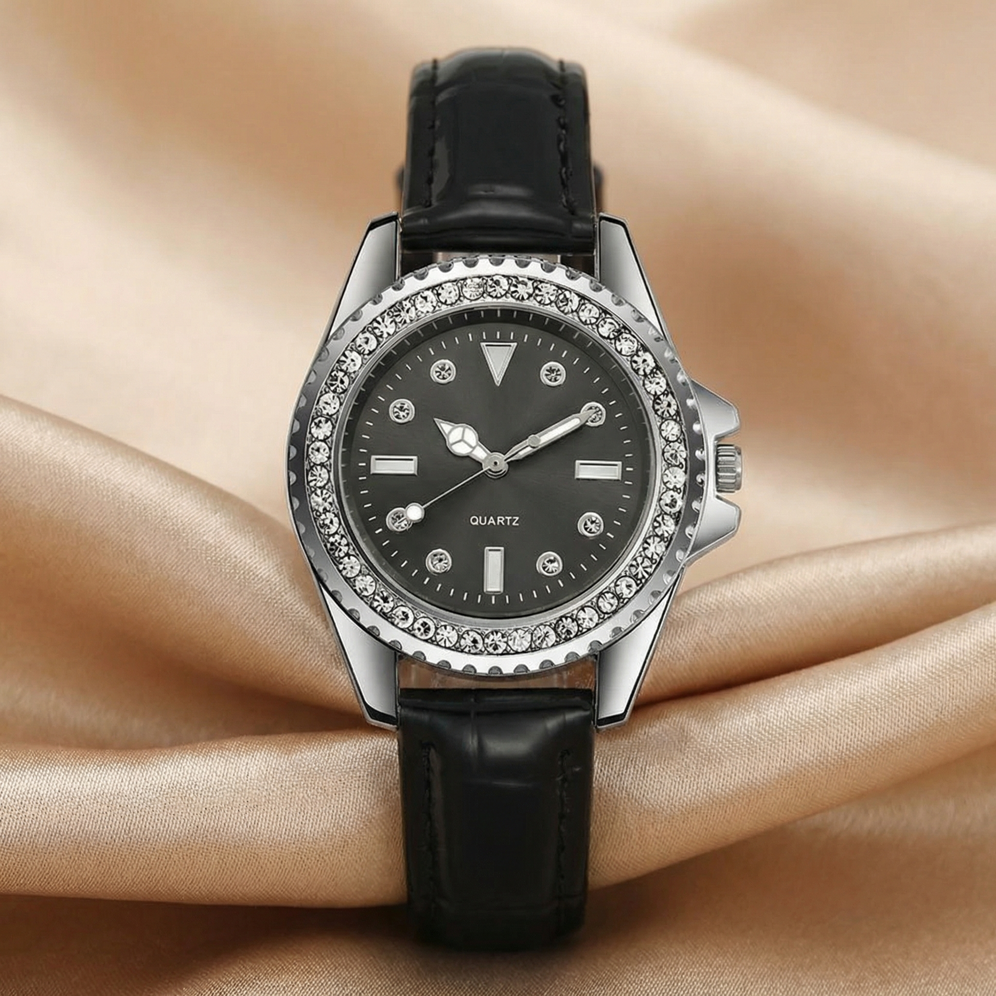 This refined watch combines a polished silver-tone case with a crystal-embellished bezel for a luxurious yet balanced look. The structured dial features subtle stone hour markers and clean detailing, creating a sophisticated finish without feeling sporty.