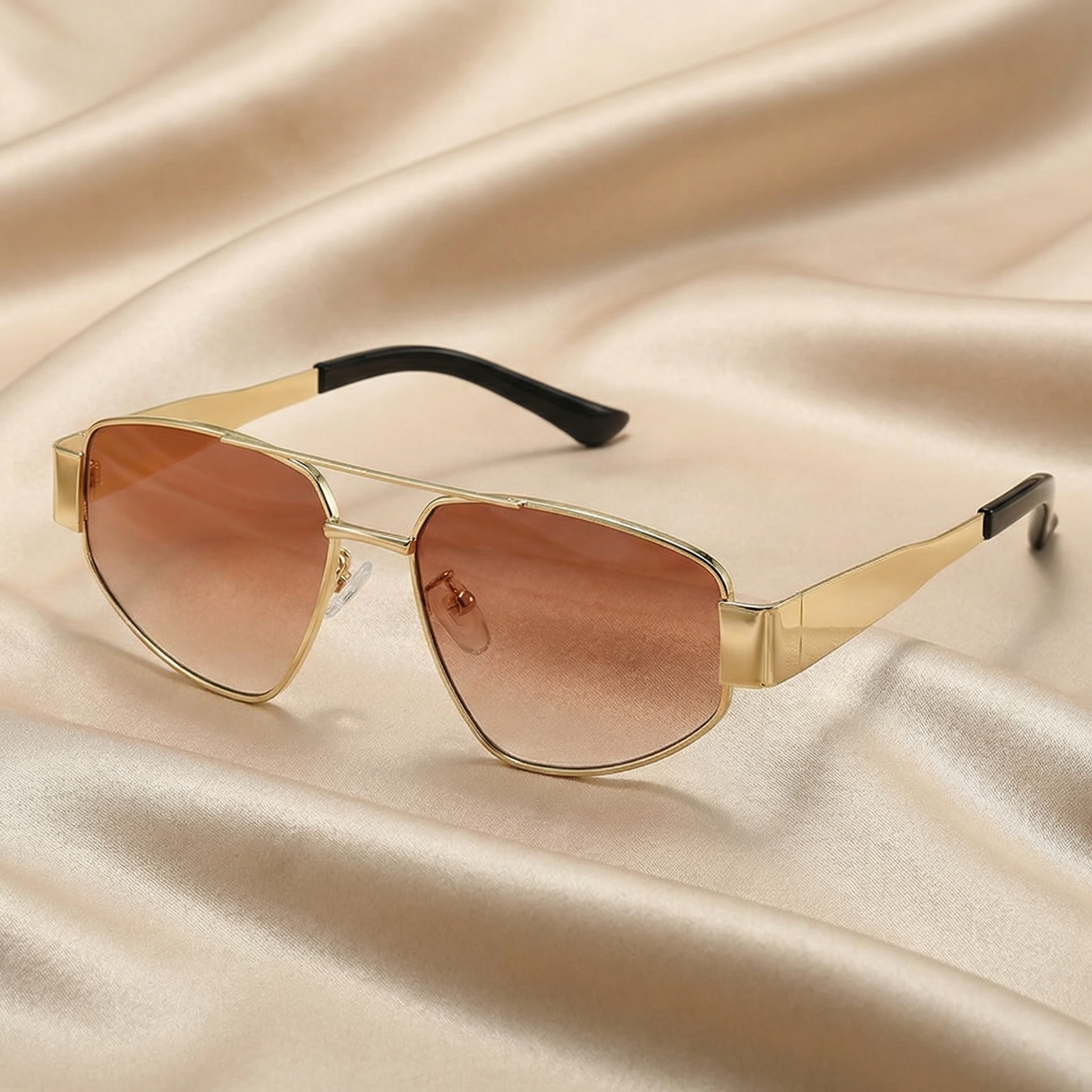 These structured square aviator sunglasses feature a polished gold metal frame paired with sleek black temple arms for a strong yet refined look. The double bridge detail enhances the silhouette, giving the design a confident and elegant presence.